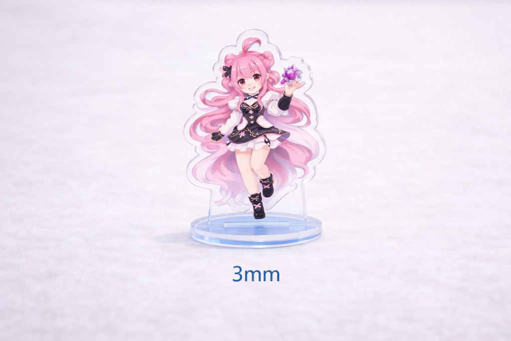 For most merchandise products such as anime standees, artist collectibles, and promotional items, 3 mm thickness is the recommended option.